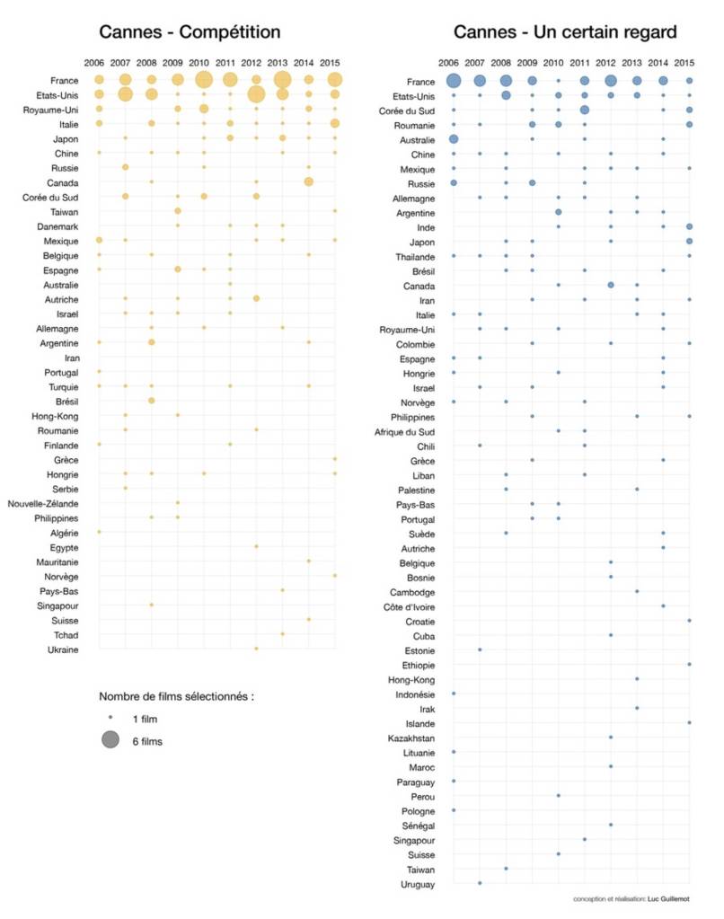 Uruguay, Portugal, Malaisie, Croatie, Allemagne, Bulgarie, Indonésie, Émirats arabes unis. Quelle particularité partagent ces pays, et quelques autres? Dans chacun d’eux, d’année en année, parmi les dix principaux succès au box-office, sept films, souvent huit ou neuf, parfois dix sont des productions nord-américaines. À l’opposé de cette razzia de l’ogre hollywoodien laissant des miettes à la concurrence, les festivals proposent une autre géographie du cinéma, marquée par la diversité et la mise en avant d’œuvres qui n’atteignent pas toujours les salles françaises. Or l’étude des films sélectionnés en compétition à Cannes depuis plusieurs décennies montre que l’un des plus prestigieux de ces festivals n’échappe que partiellement aux rapports de force du cinéma mondial.