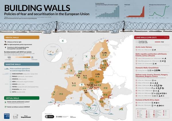 On peut s’offusquer de l’obsession de Trump pour « son » mur, prolongement de la barrière érigée à partir de 2006 sous la présidence de George W. Bush. Mais il faut garder à l’esprit un autre chiffre : depuis la chute du Mur de Berlin en 1989, les États membres de l’Union européenne et/ou de l’espace Schengen ont construit, le long de leurs frontières, près de 1000 km de murs. Sans compter les systèmes de surveillance de toutes sortes – les « murs virtuels » – ni les patrouilles en Méditerranée, les limites physiques de la « forteresse Europe » s’étendent aujourd’hui sur une distance plus de six fois supérieure à celle de la double ligne de béton armé érigée en 1961 par le gouvernement est-allemand.