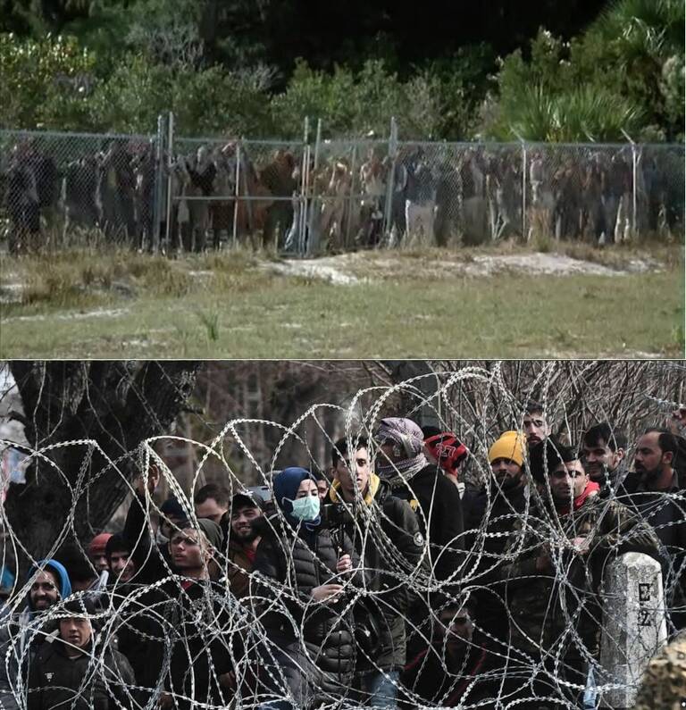 Deux images: une photographie de presse prise à la frontière entre la Grèce et la Turquie fin février et un plan issu d’un film de George Romero sorti en 1985, Le Jour des morts vivants (Day of the Dead). Trente-cinq ans et un océan les séparent, l’une appartient au registre de la fiction et l’autre non, et pourtant les ressemblances ne manquent pas: une grille, massée contre elle un flot indifférencié de corps, foule menaçante (?) perçue depuis l’autre côté de la barricade.