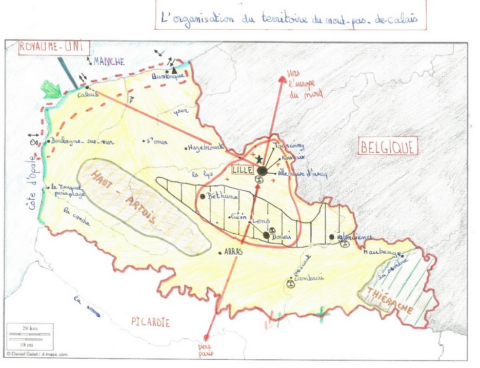 Nous sommes dans l’hiver 2010-2011. Le premier Concours Carto 4ème a été lancé depuis quelques semaines. François et Amin, deux jeunes élèves de la classe inscrite au concours me présentent ce croquis dont le sujet était « L’organisation du territoire du Pas de Calais ». Ce qu’ils ont rendu ce jour me paraît d’une qualité exceptionnelle. Certes, ces deux élèves intéressés par le cours ont de bons résultats mais je n’imaginais pas à quel point ils pouvaient être capables de s’emparer du langage cartographique pour réaliser un tel croquis avec une légende organisée.