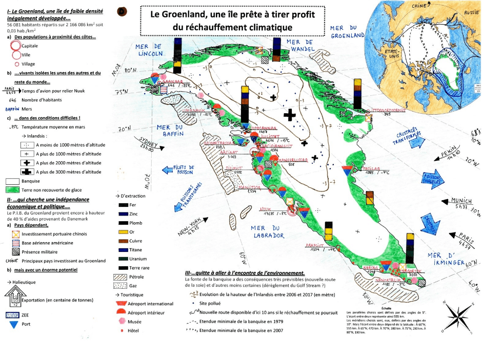Nous avons également créé deux Concours Carto Imaginaire et d’Actualité pour les CM, 6ème et 5ème d’un côté et les 4ème, 3ème et 2nde de l’autre. Dans ces deux concours, on pose un sujet et on demande un croquis pour classer les lauréats. Pour le Concours Carto Imaginaire, on propose un sujet d’anticipation géographique : Habiter sous terre, Habiter Mars, Imaginer un territoire pour mieux manger, etc., où les élèves doivent mettre leurs connaissances géographiques au service d’un croquis de territoire, on leur demande beaucoup d’imagination tout en l’ancrant dans les problématiques environnementales et politiques. Pour le Concours Carto d’Actualité il s’agit de mettre en carte un article de presse : les élèves ont déjà travaillé sur les îles Kiribati, le tourisme à Haïti ou encore le réchauffement climatique au Groenland.
