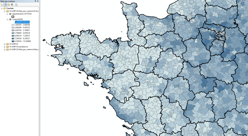 Pour mes travaux dans les semaines qui viennent, à l’échelle de la France entière, se pose aussi la question de la maille. Il y a beaucoup de cartes maintenant accessibles à l’échelle des communes, mais on s’aperçoit que l’échelle communale, comme il y a en France beaucoup de petites communes, apporte beaucoup de variance, mais de la mauvaise variance, surtout sur les données sociologiques. J’ai construit une base de données à l’échelle française en prenant comme maille de référence les pseudo-cantons INSEE : dans les grandes métropoles, la commune centre correspond à un canton et autour les cantons réunissent parfois deux ou trois communes. Il y en a environ 3 000 en France et c’est une maille intéressante car elle permet de lire le gradient entre centres métropolitains et mondes ruraux, elle permet de lire les oppositions régionales, mais avec suffisamment de finesse, et surtout elle autorise, quand on utilise les données de la statistique publique, l’accès à des nomenclatures fines. Et ça me semble être un bon compromis pour décrire la géographie de la France. Une deuxième étape sera de changer d’échelle en se centrant sur les villes centres pour les résultats de 2022, comme je l’ai fait dans mon livre pour les scrutins antérieurs.