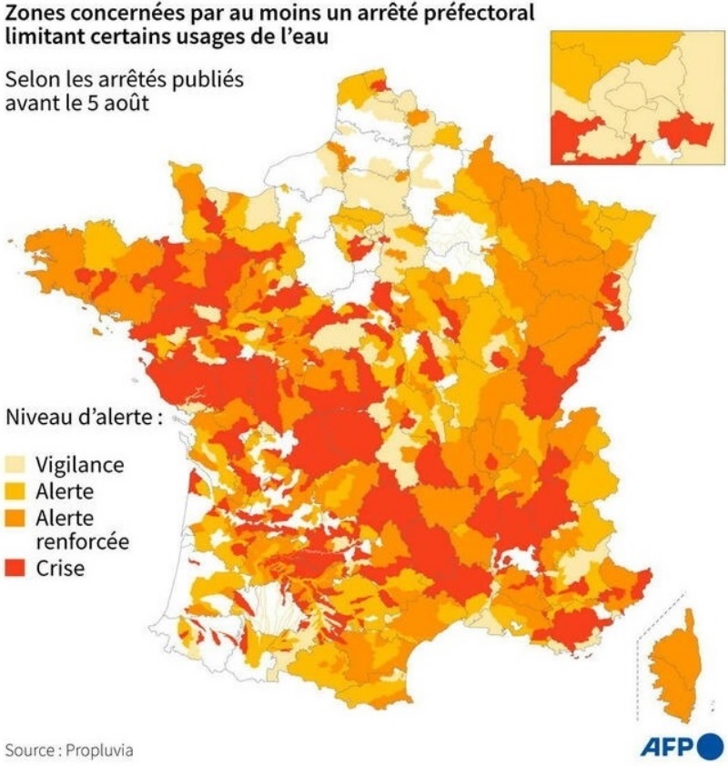 La quatrième vague de chaleur (et non canicule) de cet été laisse la France dubitative sur ce qui l’attend. Les ministres se veulent pédagogues, en prévenant que plus de cent communes début août sont déjà privées d’eau potable (mises à part celles de Bretagne pour cause de nitrates). Pédagogie ? ils annoncent le pire, des « tensions » sur le partage de la ressource. La technostructure administrative prépare des plans Orsec « eau » mais permet les rejets d’eau chaude pour 5 centrales nucléaires, choie les maraîchers, céréaliers et autres éleveurs, prévient qu’il y aura des contrôles.