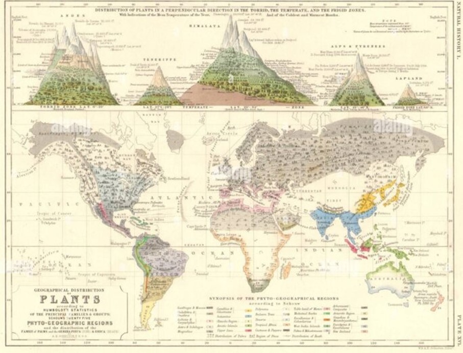 Les premières cartes de Ptolémée, enrichies à la Renaissance (voir la couverture de Cassini au XVIIIe siècle), puis les descriptions de Humboldt et Bonpland en Amazonie en 1800 conduisant au Tableau physique, aux lignes isothermes et à la première carte de la géographie des végétaux dans le monde donnent des informations qui vont conduire à l’exploitation des forêts.