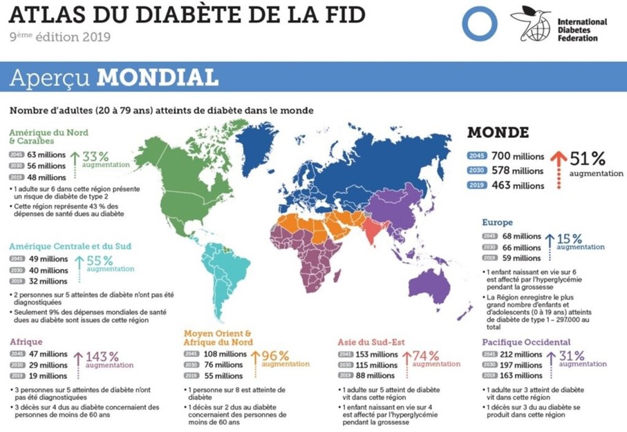 Le diabète de type 1 est diagnostiqué plutôt chez les jeunes (de l’enfance jusqu’à l’âge de 25 ans). Pathologie auto-immune, ce diabète (2500 nouveaux cas par an en France) progresse de près de 5% par an depuis les années 2010. D’origine gestationnel et lié à une hyperglycémie pendant la grossesse, le diabète touche, à l’échelle mondiale, plus de 20 millions de femmes. La géographie marque une surreprésentation en Asie du Sud-Est qui compte le tiers des cas. La plupart des nouveaux cas seront diagnostiqués en 2045 dans les pays pauvres, notamment en Afrique subsaharienne où leur part va doubler. En 2022, ce sont les îles de l’Océanie et l’Australie, l’Afrique du Nord et le Moyen-Orient les plus touchés avec une progression fulgurante: plus 20% d’ici 2050. Le record est au Qatar.