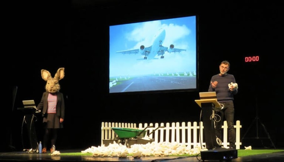 FF – En effet, je présente au Théâtre du Rond-Point ma septième Cartographie de l’Atlas de l’anthropocène, un cycle artistique que j’ai commencé en 2010 avec «À la recherche des canards perdus» (Cartographie 1). Cette fois-ci cela s’appelle «Le problème lapin», parce que précisément les lapins posent problème. Parce qu’ils ne sont jamais là où on les attend. Parce qu’ils sont souvent là où on ne les attend pas. Parce qu’ils débordent tout le temps des cases dans lesquelles Homo Sapiens veut les maintenir. Parce que c’est une espèce considérée comme invasive et nuisible dans de nombreux territoires, parce qu’elle se répand rapidement en détruisant son environnement et en posant de très nombreux problèmes écologiques. Et parce qu’elle est aussi en voie d’extinction dans d’autres territoires. Pour toutes ces raisons, et pour beaucoup d’autres, les lapins questionnent nos systèmes de développement et nos rapports au vivant et au monde. C’est donc une espèce passionnante à observer. D’autant que je fais le pari que nous avons beaucoup à apprendre d’elle, tant elle déborde tout le temps et modifie les situations données, remodèle en permanence les espaces, provoque des ruptures d’équilibre… Le lapin est un éclaireur de nos mouvements!