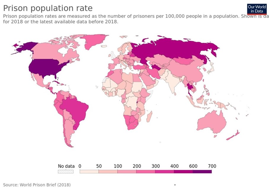 La violence, c’est aussi l’enfermement. D’après le World Prison Brief, les États-Unis sont le pays qui a le plus fort taux de détenus par habitant (666 prisonniers/100 000 habitants, soit 2 145 000 personnes derrière les barreaux) à comparer avec le Brésil (trois fois moins par habitant). Et toujours une surenchère pour construire de nouvelles prisons.