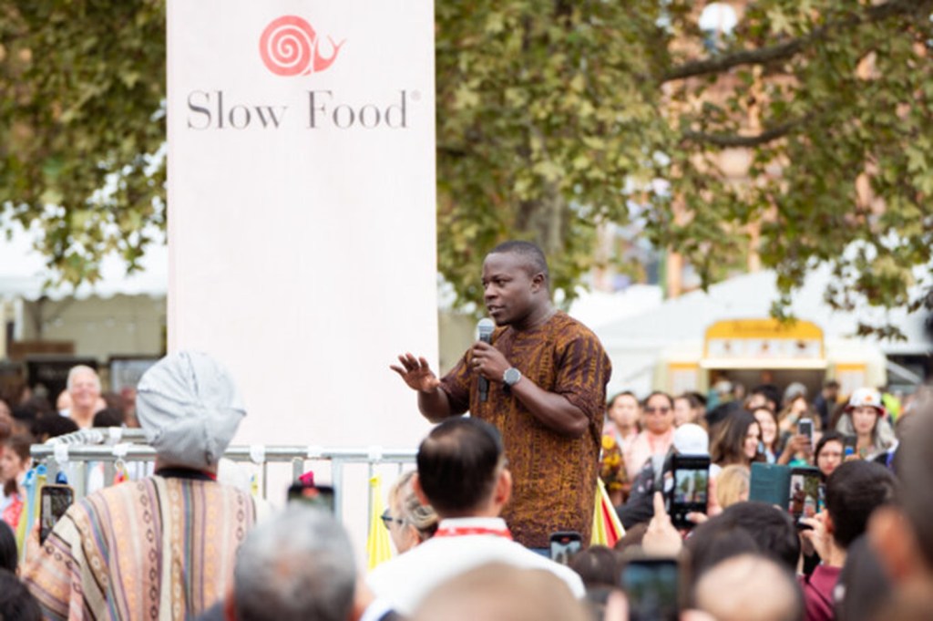 Edward Mukiibi, président de Slow Food, s’est adressé aux 3000 délégués rassemblés autour de la scène du Parco Dora pour la cérémonie d’ouverture.
