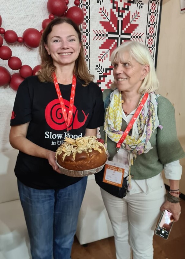 En sortant des noces, nous avons été cueillis par l’Ukrainienne Yulia Pitenko (photo à gauche, avec Fanny Bréchard), qui a pu quitter son pays le temps de Terra Madre, représentant l’Ukraine chaleureusement accueillie à Turin. À Kiev où elle vit, Yulia raconte combien la nation ukrainienne se rassemble autour de fêtes calendaires et familiales qui sont autant d’occasions de créer des pains qui ont tous des recettes et esthétiques différente. De la naissance à la mort, tous les Ukrainiens sont accompagnés par des rites de repas où les chefs d’œuvre boulangers se surpassent dans le talent.