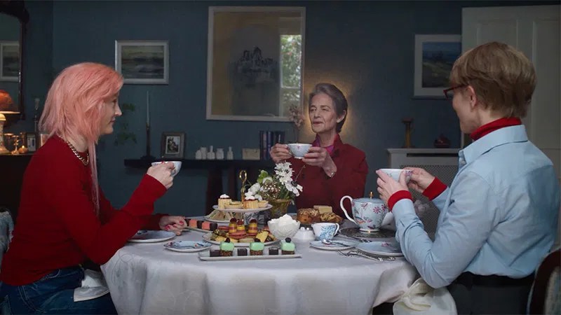 Le plan surgit à mi-chemin du film: une plongée verticale de quelques secondes sur une table élégamment dressée, alors que le temps peine à s’écouler entre une mère et ses deux filles, engoncées dans un goûter où se succèdent banalités, silences gênants et vagues nouvelles personnelles ou professionnelles. La mère, qui donne son nom au deuxième volet du triptyque de Jarmusch, c’est Charlotte Rampling, écrivaine à succès et vieille bourgeoise rigide à faire peur. Sur les conseils de sa thérapeute, elle convie une fois par an Lilith – Vicky Krieps, coolitude et cheveux roses – et Timothea – Cate Blanchett, montures de lunettes trop larges et timidité crispée – à prendre le thé dans sa maison dublinoise. Accompagnant le rouge dans les tasses, les pâtisseries chics parsèment la table de rose, de vert et de jaune, tentative dérisoire de camoufler la grisaille des relations unissant le trio, saturées de non-dits et de rancœurs.